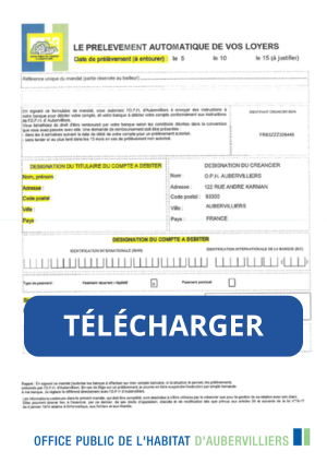 Découpez votre TIP sans le signer. Glissez-le dans l’enveloppe jointe à votre avis d’échéance avec votre chèque bancaire dûment rempli et signé à l’ordre de l’OPH d’Aubervilliers. Vous pouvez à votre convenance soit déposer votre enveloppe auprès de votre bureau d’accueil durant la période d’encaissement indiquée sur votre avis d’échéance soit timbrer l’enveloppe et l’envoyer par courrier postal à l’adresse figurant sur le TIP.